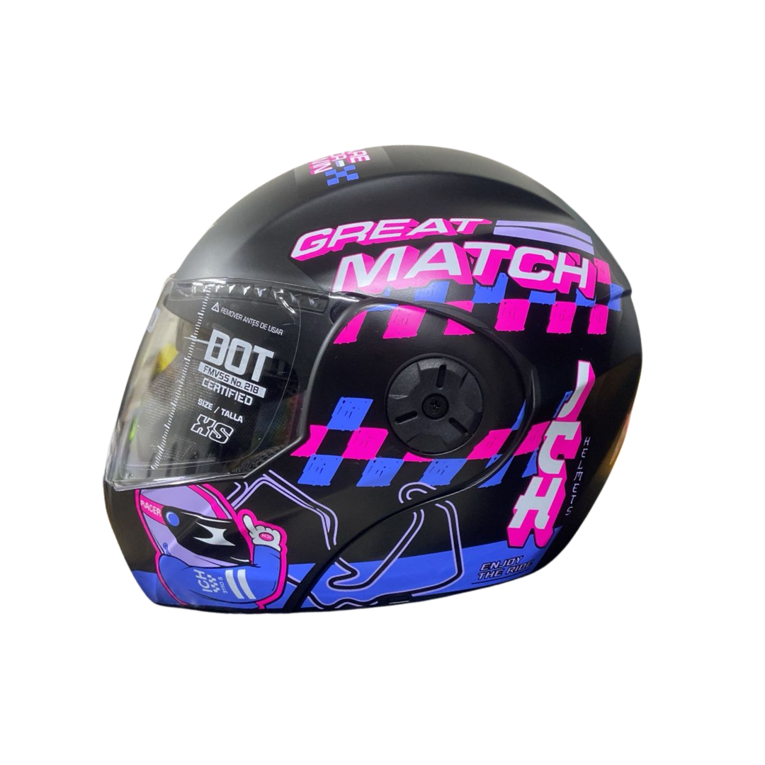 Casco abatible diseñado para niñas, ideal para ofrecer protección, comodidad y estilo. El modelo ICH 3110 Eracer cuenta con detalles en color morado sobre un acabado negro mate, visor transparente y un sistema abatible práctico y seguro.